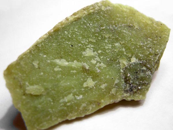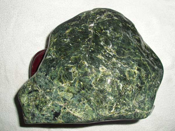 蛇紋石質(zhì)玉石質(zhì)地呈細(xì)膩的致密塊體,質(zhì)地細(xì)膩,用手觸摸有滑感。它由細(xì)小纖維狀、葉片狀和膠狀蛇紋石晶體組成,呈網(wǎng)斑狀結(jié)構(gòu)。有時(shí)在均勻分布的基底上,可見密集堆積的云朵狀白色斑狀。少數(shù)纖維狀塊體琢磨后有貓眼效應(yīng)。