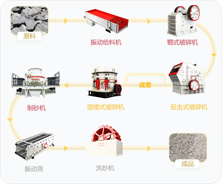 設(shè)備配置:顎式破碎機(jī)、反擊式破碎機(jī)或液壓圓錐破,制砂機(jī)洗砂機(jī),圓振動(dòng)篩等設(shè)備